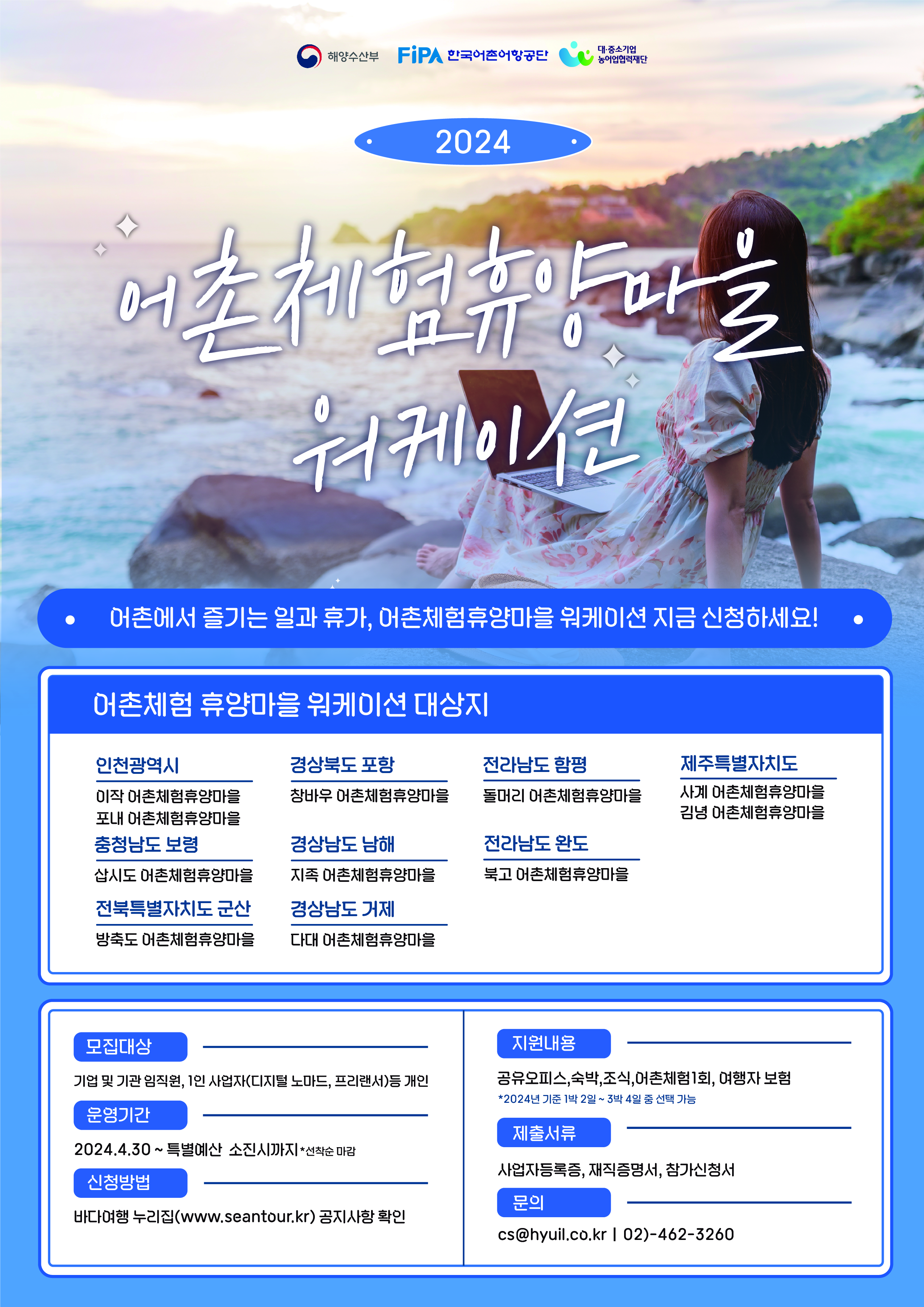 「2024년 어촌마을 워케이션」은 여러분이 일과 휴식을 조화롭게 즐길 수 있도록 설계된 특별한 여행 지원 프로그램입니다. 이 프로그램은 전국의 아름다운 어촌 마을에서의 워케이션을 지원합니다. 프로그램의 기간은 2024년 4월 30일부터 특별 예산이 소진될 때까지이며, 선착순으로 운영됩니다.